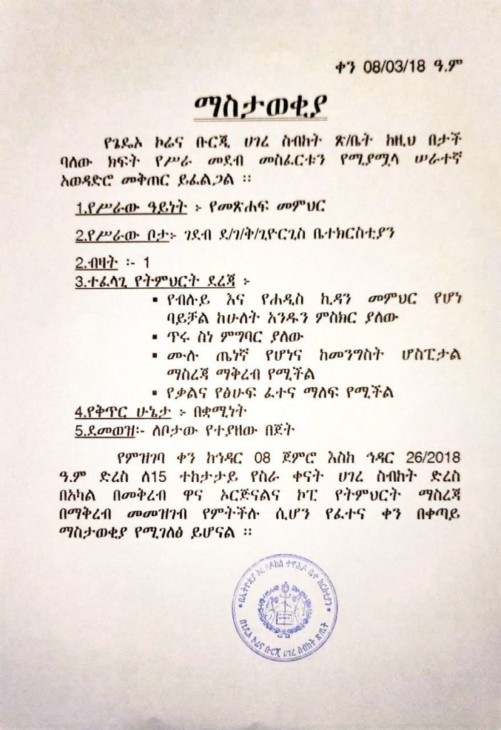 የጌዴኦ ኮሬና ቡርጂ ሀገረ ስብከት ጽሕፈት ቤት ለገደብ ደብረ ገነት ቅዱስ ጊዮርጊስ ቤተ ክርስቲያን የመጽሐፍ መምህር አወዳድሮ መቅጠር ይፈልጋል! / Uncategorized / By Public Relation