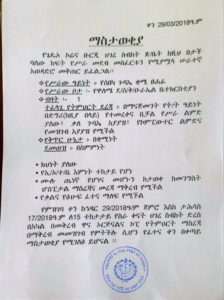 የጌዴኦ ኮሬና ቡርጂ ሀገረ ስብከት ጽሕፈት ቤት ከዚህ በታች ባለው ክፍት የሥራ መደብ መስፈርቱን የሚያሟላ ሠራተኛ አወዳድሮ መቅጠር ይፈልጋል።