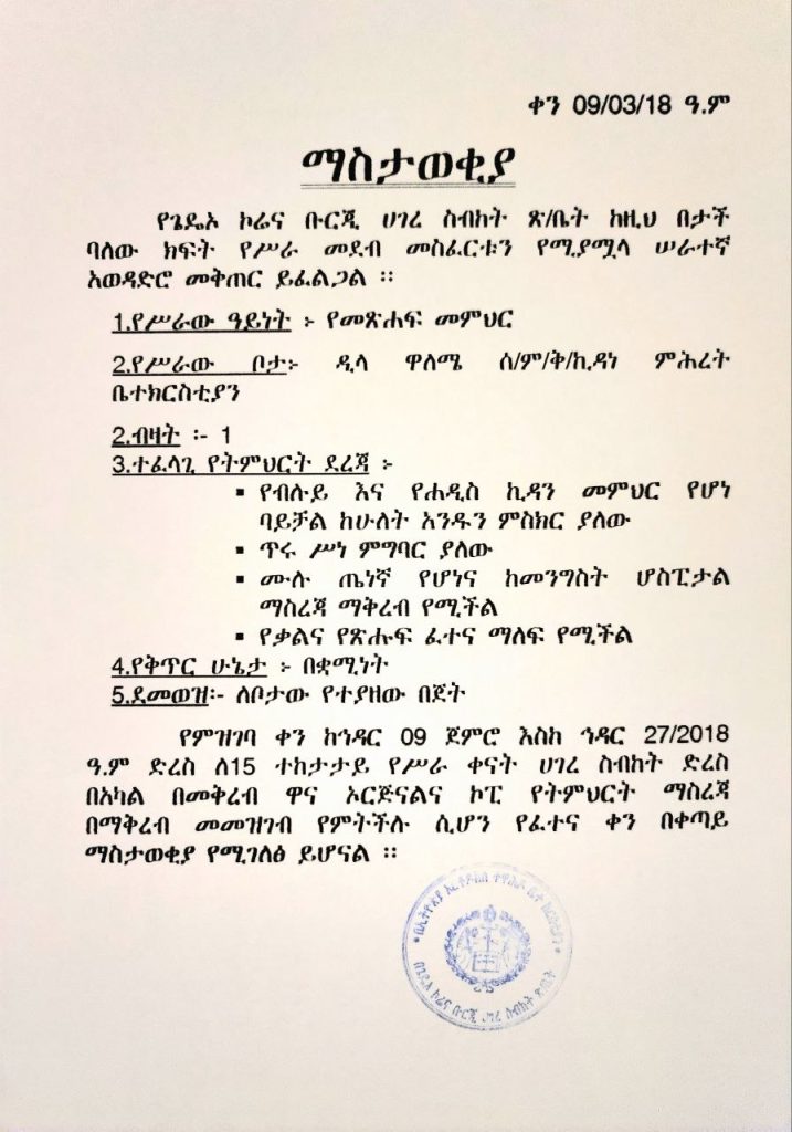 የጌዴኦ ኮሬና ቡርጂ ሀገረ ስብከት ከዚህ በታች ባለው ክፍት የሥራ መደብ መስፈርቱን የሚያሟላ ሠራተኛ አወዳድሮ መቅጠር ይፈልጋል።